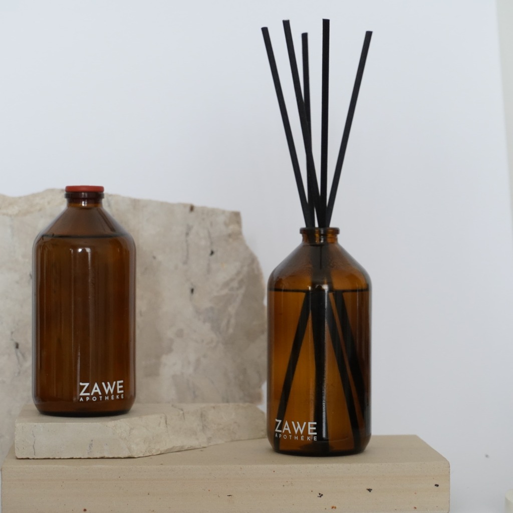 Embalagem em vidro âmbar e varetas de fibra de algodão.